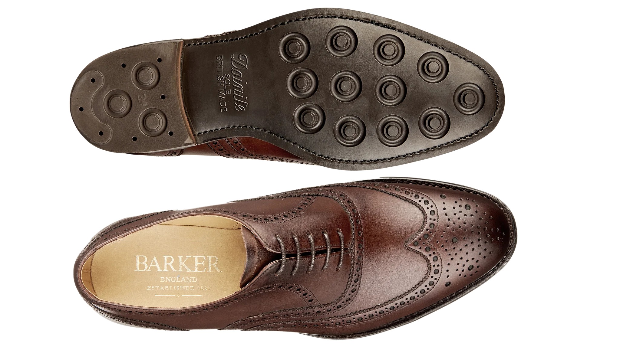 Full brogue Oxford shoes. The elegant silhouette and closed lacing make them refined, while the color and decorative detailing give them a less formal character, making them perfect for smart casual outfits. Barker is a legendary English shoemaker crafting footwear in Northamptonshire since 1880.